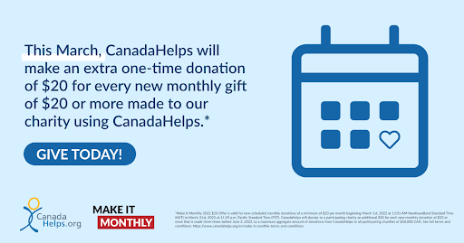 CanadaHelps, our monthly giving platform, will donate an additional $20 for every new monthly gift of $20 or more!